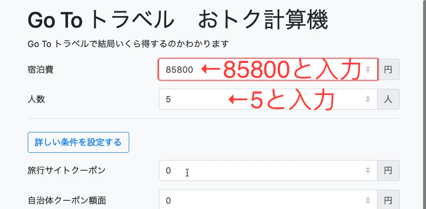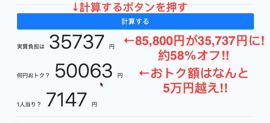 今回は宿泊費に85,800円、人数に5人と入力します。