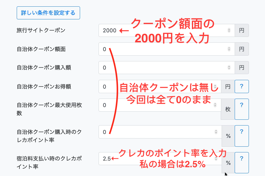 宿泊料支払時のクレカポイントは僕の場合は2.5%なので2.5%と入力します。