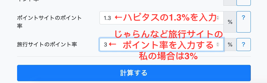 ポイントサイトのポイント率にはハピタスの1.3%を入力します。